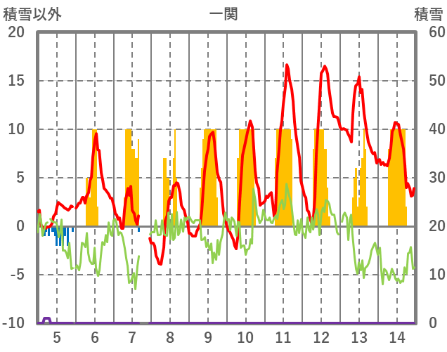 | 日 | 時 | 気温 | 降水 | 風向/風速 | 日照 | 積雪 | 降雪 |