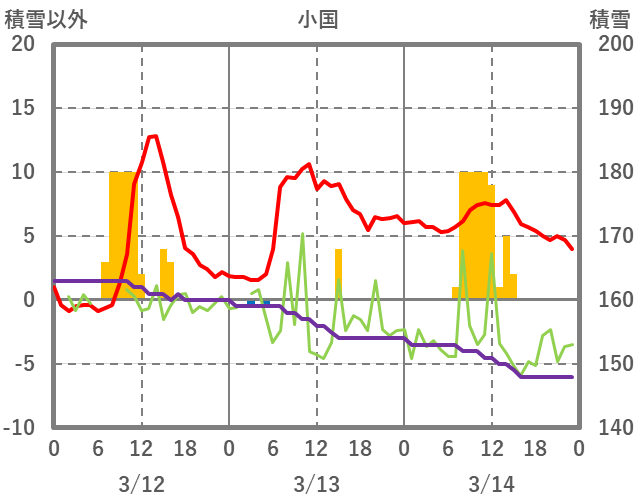 | 日 | 時 | 気温 | 降水 | 風向/風速 | 日照 | 積雪 | 降雪 |