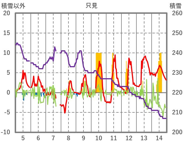 | 日 | 時 | 気温 | 降水 | 風向/風速 | 日照 | 積雪 | 降雪 |