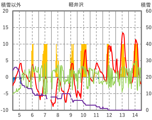 | 日 | 時 | 気温 | 降水 | 風向/風速 | 日照 | 積雪 | 降雪 |