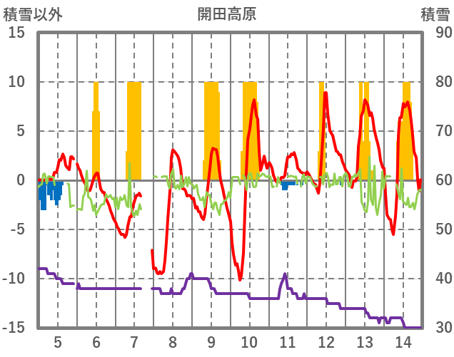| 日 | 時 | 気温 | 降水 | 風向/風速 | 日照 | 積雪 | 降雪 |