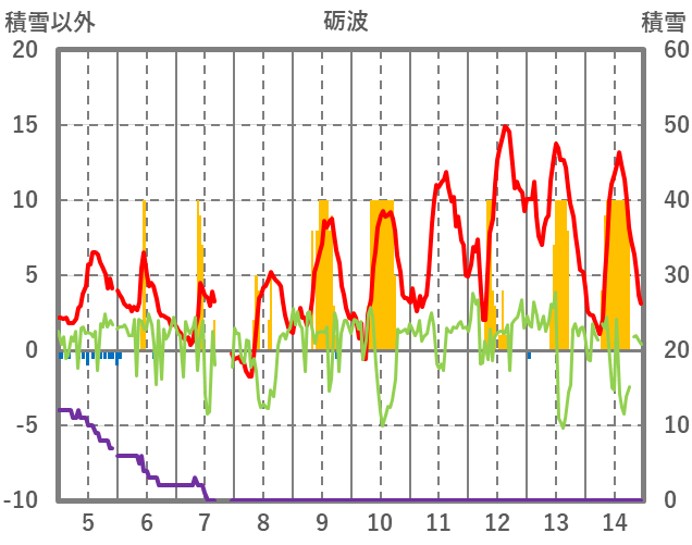 | 日 | 時 | 気温 | 降水 | 風向/風速 | 日照 | 積雪 | 降雪 |