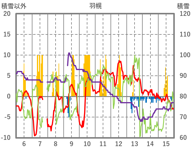 | 日 | 時 | 気温 | 降水 | 風向/風速 | 日照 | 積雪 | 降雪 |