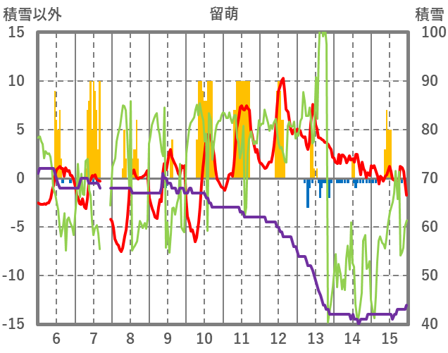 | 日 | 時 | 気温 | 降水 | 風向/風速 | 日照 | 積雪 | 降雪 |