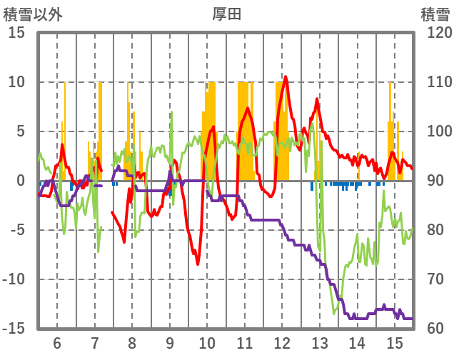 | 日 | 時 | 気温 | 降水 | 風向/風速 | 日照 | 積雪 | 降雪 |