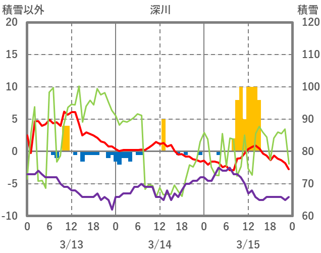 | 日 | 時 | 気温 | 降水 | 風向/風速 | 日照 | 積雪 | 降雪 |