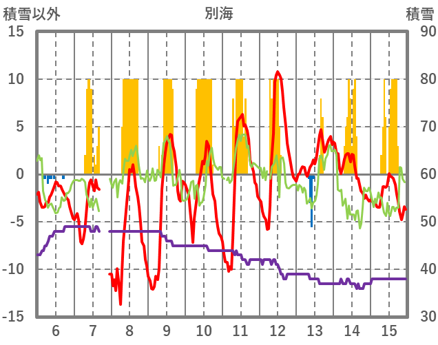 | 日 | 時 | 気温 | 降水 | 風向/風速 | 日照 | 積雪 | 降雪 |