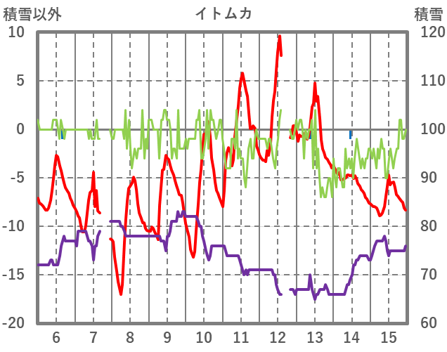 | 日 | 時 | 気温 | 降水 | 風向/風速 | 日照 | 積雪 | 降雪 |