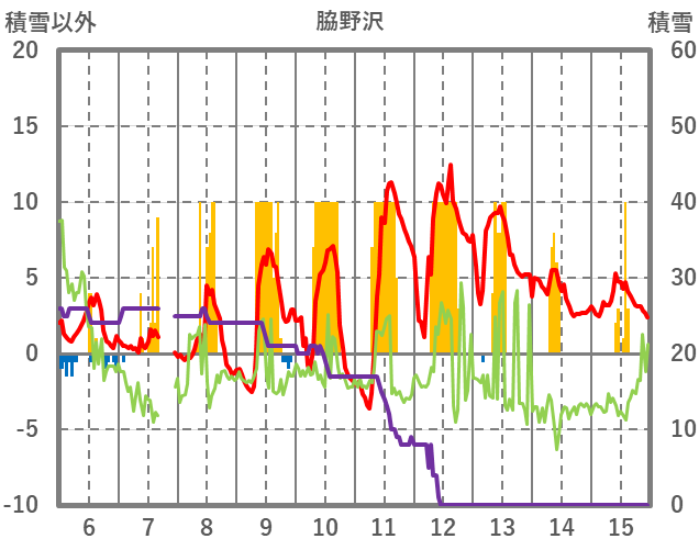 | 日 | 時 | 気温 | 降水 | 風向/風速 | 日照 | 積雪 | 降雪 |