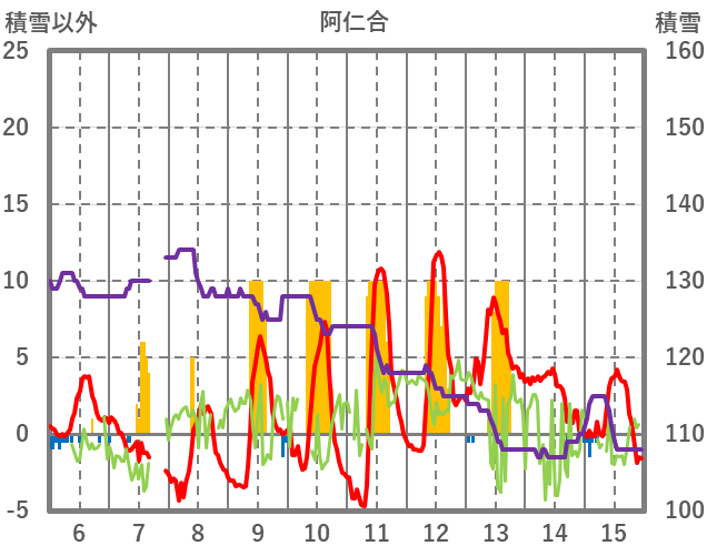 | 日 | 時 | 気温 | 降水 | 風向/風速 | 日照 | 積雪 | 降雪 |