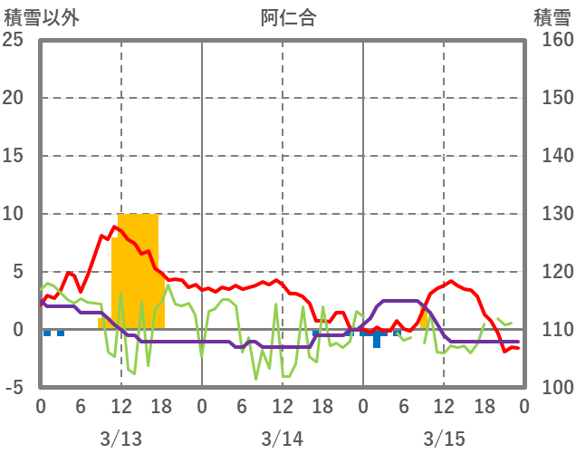 | 日 | 時 | 気温 | 降水 | 風向/風速 | 日照 | 積雪 | 降雪 |