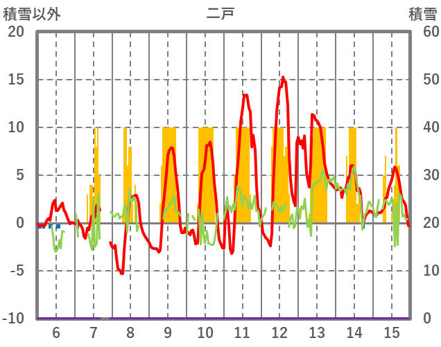 | 日 | 時 | 気温 | 降水 | 風向/風速 | 日照 | 積雪 | 降雪 |