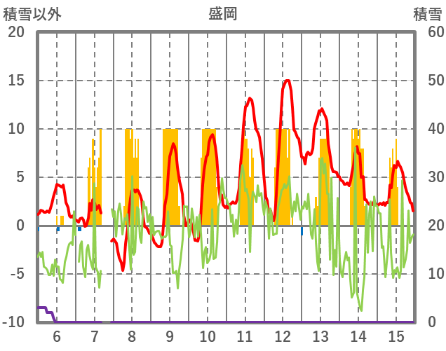 | 日 | 時 | 気温 | 降水 | 風向/風速 | 日照 | 積雪 | 降雪 |