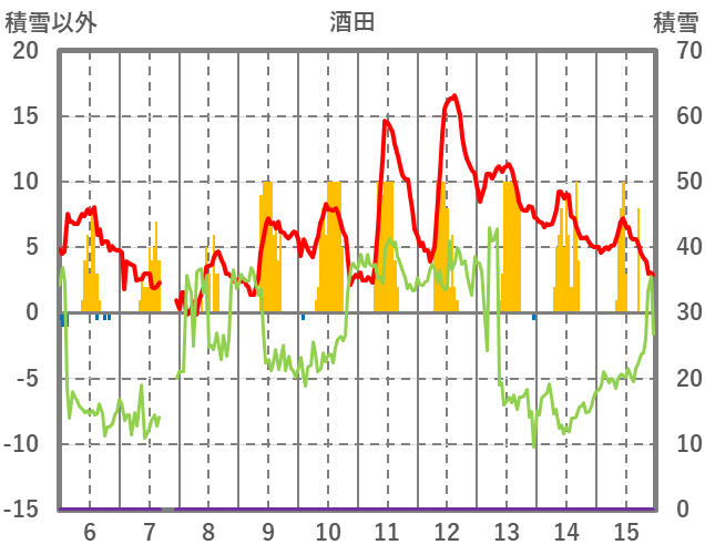 | 日 | 時 | 気温 | 降水 | 風向/風速 | 日照 | 積雪 | 降雪 |