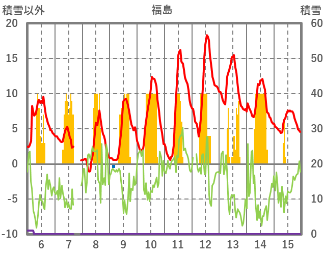 | 日 | 時 | 気温 | 降水 | 風向/風速 | 日照 | 積雪 | 降雪 |