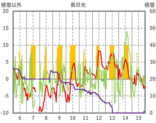 | 日 | 時 | 気温 | 降水 | 風向/風速 | 日照 | 積雪 | 降雪 |