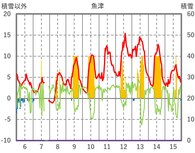 | 日 | 時 | 気温 | 降水 | 風向/風速 | 日照 | 積雪 | 降雪 |