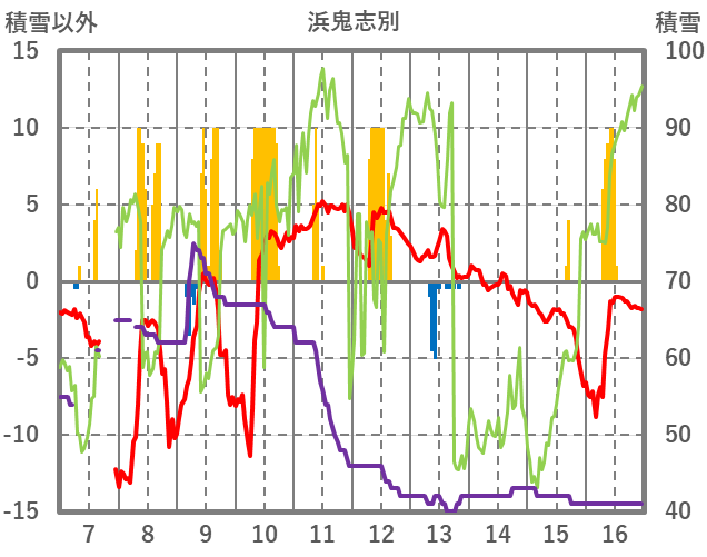 | 日 | 時 | 気温 | 降水 | 風向/風速 | 日照 | 積雪 | 降雪 |