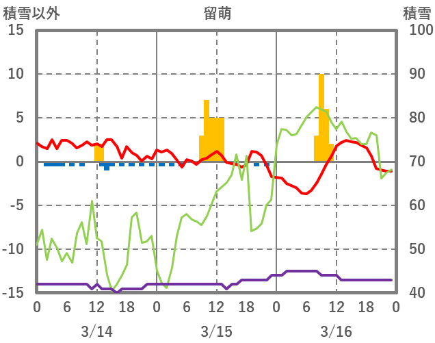 | 日 | 時 | 気温 | 降水 | 風向/風速 | 日照 | 積雪 | 降雪 |