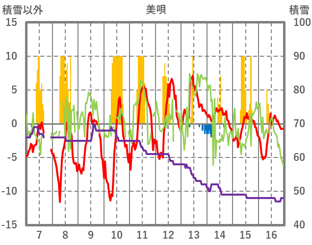 | 日 | 時 | 気温 | 降水 | 風向/風速 | 日照 | 積雪 | 降雪 |