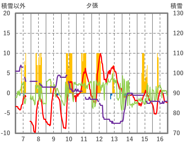 | 日 | 時 | 気温 | 降水 | 風向/風速 | 日照 | 積雪 | 降雪 |