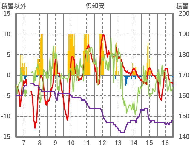 | 日 | 時 | 気温 | 降水 | 風向/風速 | 日照 | 積雪 | 降雪 |
