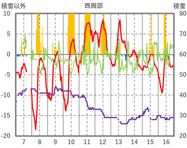 | 日 | 時 | 気温 | 降水 | 風向/風速 | 日照 | 積雪 | 降雪 |