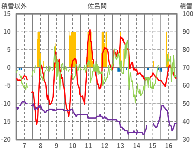 | 日 | 時 | 気温 | 降水 | 風向/風速 | 日照 | 積雪 | 降雪 |