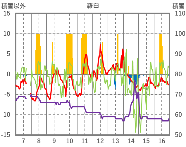 | 日 | 時 | 気温 | 降水 | 風向/風速 | 日照 | 積雪 | 降雪 |