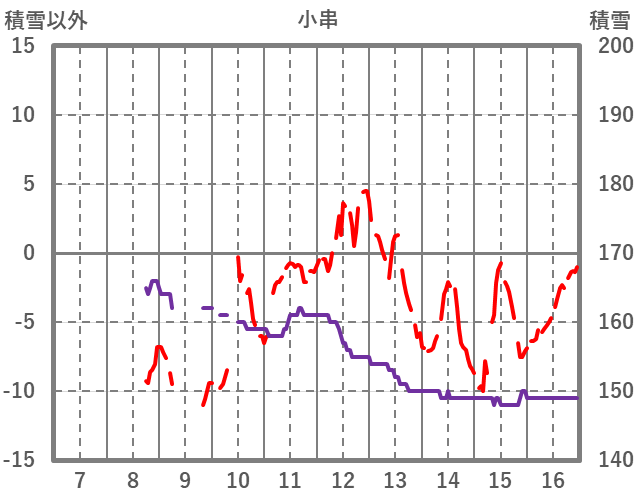 | 日 | 時 | 気温 | 降水 | 風向/風速 | 日照 | 積雪 | 降雪 |