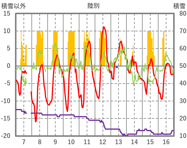 | 日 | 時 | 気温 | 降水 | 風向/風速 | 日照 | 積雪 | 降雪 |