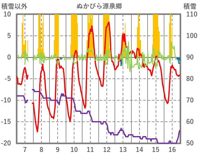 | 日 | 時 | 気温 | 降水 | 風向/風速 | 日照 | 積雪 | 降雪 |