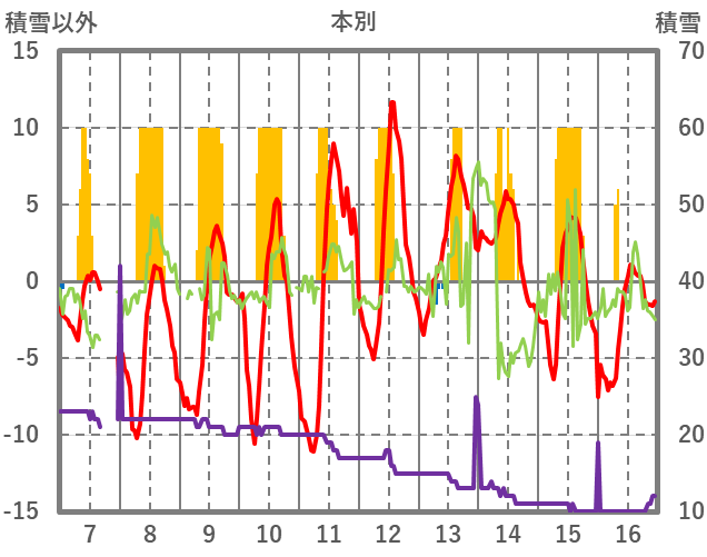 | 日 | 時 | 気温 | 降水 | 風向/風速 | 日照 | 積雪 | 降雪 |