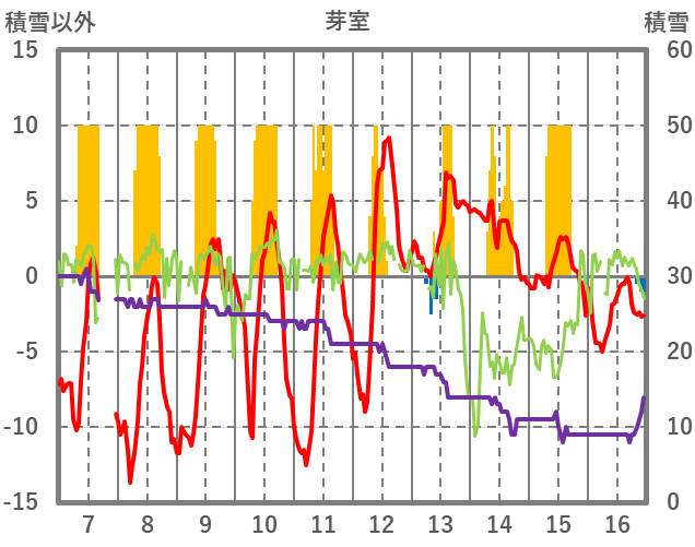 | 日 | 時 | 気温 | 降水 | 風向/風速 | 日照 | 積雪 | 降雪 |