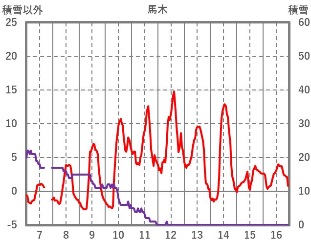 | 日 | 時 | 気温 | 降水 | 風向/風速 | 日照 | 積雪 | 降雪 |
