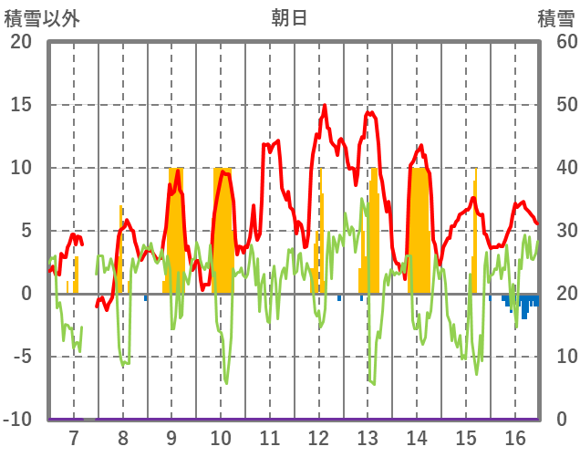 | 日 | 時 | 気温 | 降水 | 風向/風速 | 日照 | 積雪 | 降雪 |