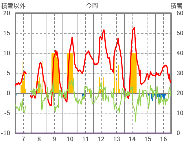| 日 | 時 | 気温 | 降水 | 風向/風速 | 日照 | 積雪 | 降雪 |