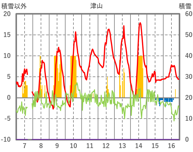 | 日 | 時 | 気温 | 降水 | 風向/風速 | 日照 | 積雪 | 降雪 |