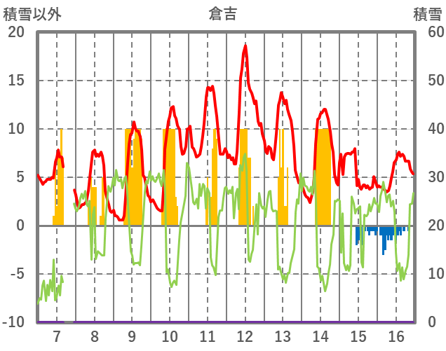 | 日 | 時 | 気温 | 降水 | 風向/風速 | 日照 | 積雪 | 降雪 |