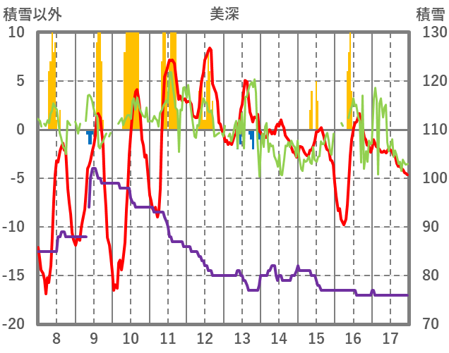 | 日 | 時 | 気温 | 降水 | 風向/風速 | 日照 | 積雪 | 降雪 |