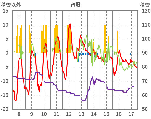 | 日 | 時 | 気温 | 降水 | 風向/風速 | 日照 | 積雪 | 降雪 |