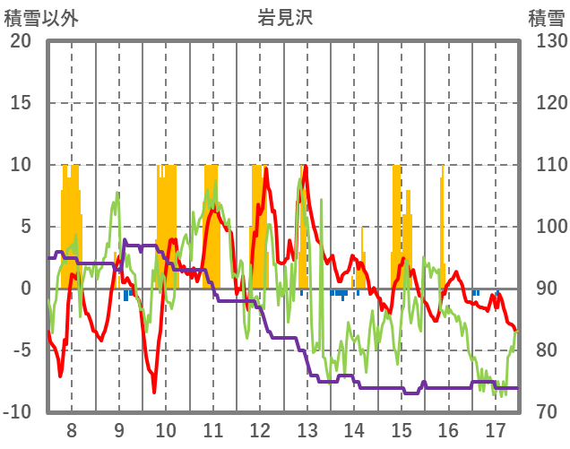 | 日 | 時 | 気温 | 降水 | 風向/風速 | 日照 | 積雪 | 降雪 |