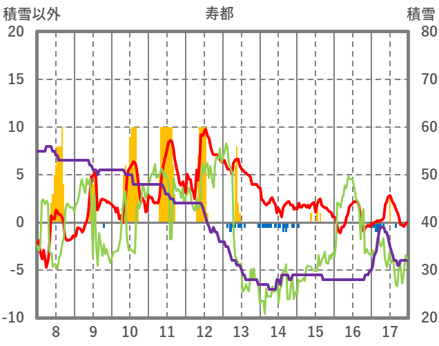 | 日 | 時 | 気温 | 降水 | 風向/風速 | 日照 | 積雪 | 降雪 |