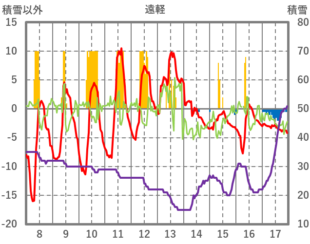 | 日 | 時 | 気温 | 降水 | 風向/風速 | 日照 | 積雪 | 降雪 |