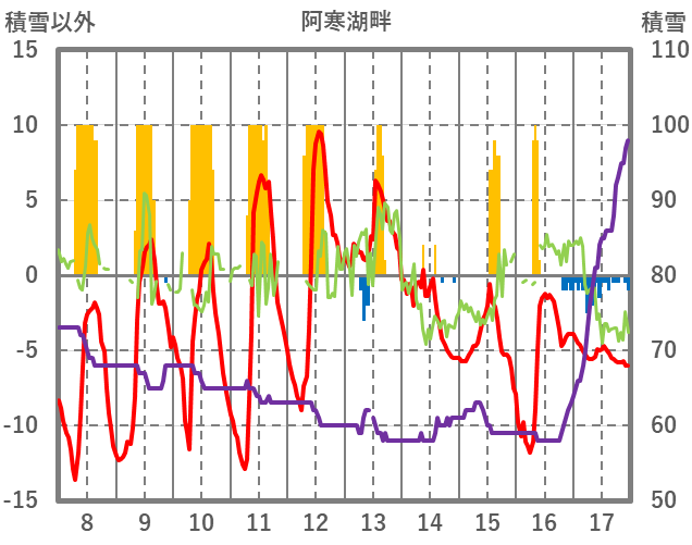 | 日 | 時 | 気温 | 降水 | 風向/風速 | 日照 | 積雪 | 降雪 |