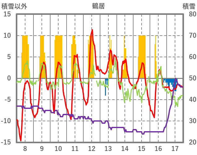 | 日 | 時 | 気温 | 降水 | 風向/風速 | 日照 | 積雪 | 降雪 |