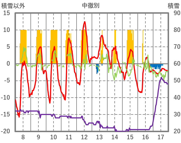 | 日 | 時 | 気温 | 降水 | 風向/風速 | 日照 | 積雪 | 降雪 |