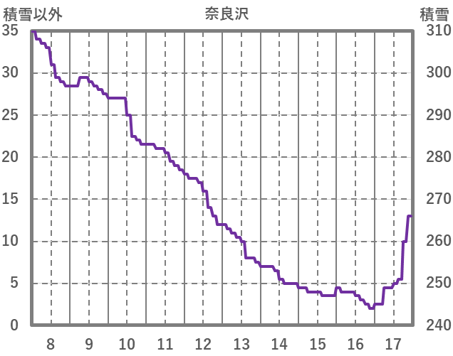| 日 | 時 | 気温 | 降水 | 風向/風速 | 日照 | 積雪 | 降雪 |