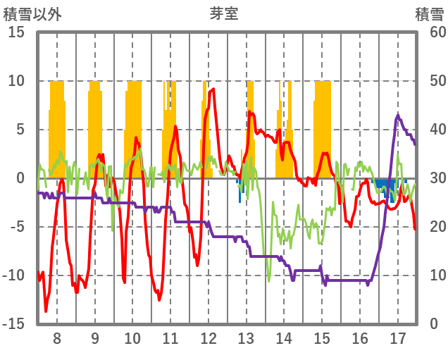 | 日 | 時 | 気温 | 降水 | 風向/風速 | 日照 | 積雪 | 降雪 |