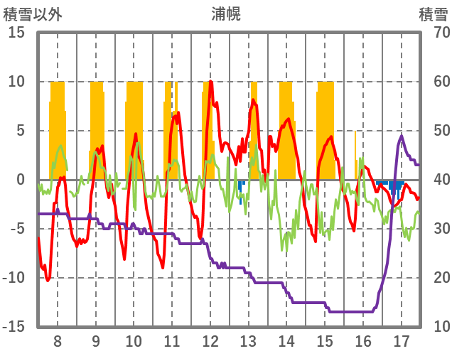| 日 | 時 | 気温 | 降水 | 風向/風速 | 日照 | 積雪 | 降雪 |